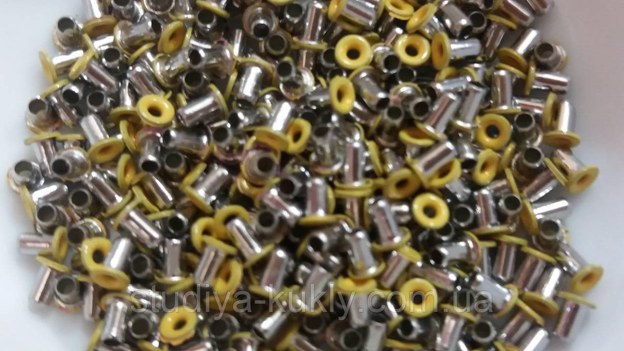 Мікро-люверси для ляльок, колір капелюшка - жовтий. Діаметр ніжки 1 мм, діаметр капелюшка 2.5 мм. Висота 3 мм.